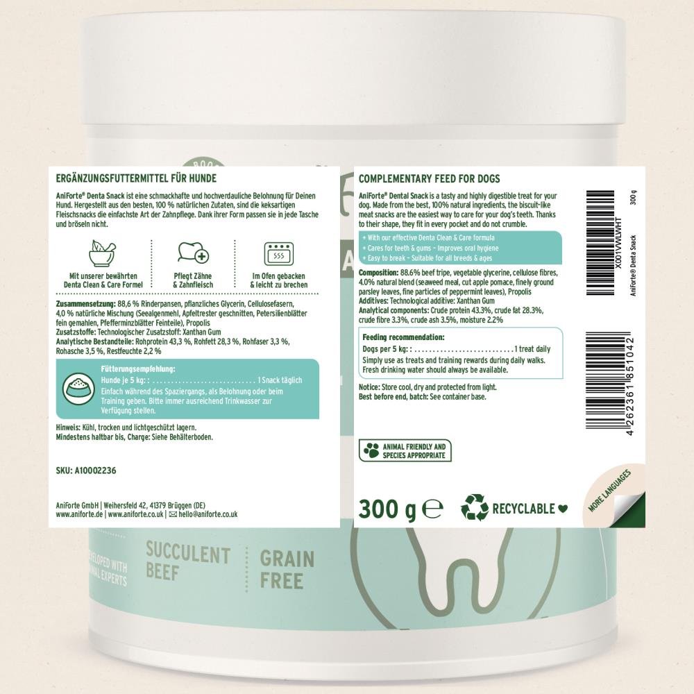 AniForte® Denta-Snacks werden ausschließlich aus den besten, 100 % natürlichen Zutaten hergestellt. Dank ihrer Form passen sie problemlos in jede Hosentasche und zerbröseln nicht. Durch ihre keksartige Konsistenz lassen sie sich leicht portionieren und sind für alle Fellnasen geeignet, egal ob groß oder klein. Die Denta-Snacks sind so konzipiert, dass sie beim Kauen an den Zähnen reiben und so helfen, Plaque und Zahnstein zu entfernen.