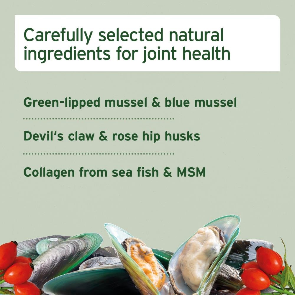 78% Hühnerfleisch, 3% Grünlippmuschelpulver aus Neuseeland, Miesmuschelflocken (Mytilus edulis) aus MSC-zertifizierter Aquakultur, 2% Hagebuttenschalen (0.2% Vitamin C), 2% Teufelskrallenpulver, 1.5% Kollagenpulver aus Seefisch, 1.5% Omega-3-Fischmehl, Kurkuma, 0.3% Methylsulfonylmethan (MSM), schwarzer Pfeffer, Cellulosefasern, pflanzliches Glycerin