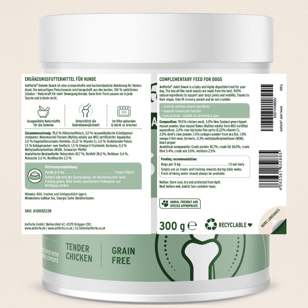100 % natürliche, funktionale Snacks für aktive Hunde – gutes Verhalten sollte belohnt werden! Was gibt es Schöneres, als deinen Hund zu belohnen und ihm gleichzeitig etwas Gutes zu tun? AniForte® Gelenksnacks vereinen beides! Diese praktischen Snacks enthalten eine ausgewählte Mischung aus neuseeländischem Grünlippmuschelpulver, Miesmuschelflocken, Fischkollagen, Hagebutte, Teufelskralle, MSM, Kurkuma, schwarzem Pfeffer und Omega-3-Fettsäuren – ein Kraftpaket zur Unterstützung der Gelenkmobilität deines Hundes.