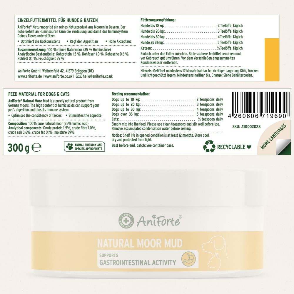 AniForte® Naturmoor ist ein reines Naturprodukt aus deutschen Mooren. Der hohe Gehalt an Huminsäure kann die Verdauung und das Immunsystem deines Haustieres unterstützen und wird einfach unter das tägliche Futter gemischt. Naturmoor ist eines der ältesten Naturprodukte und ein traditionelles Hausmittel – seit Generationen wird es bei Menschen und Tieren zur inneren und äußeren Anwendung genutzt. Durch einen natürlichen biochemischen Prozess entsteht über Jahrtausende hinweg eine organische Masse, die eine einzigartige Kombination wertvoller Inhaltsstoffe enthält.