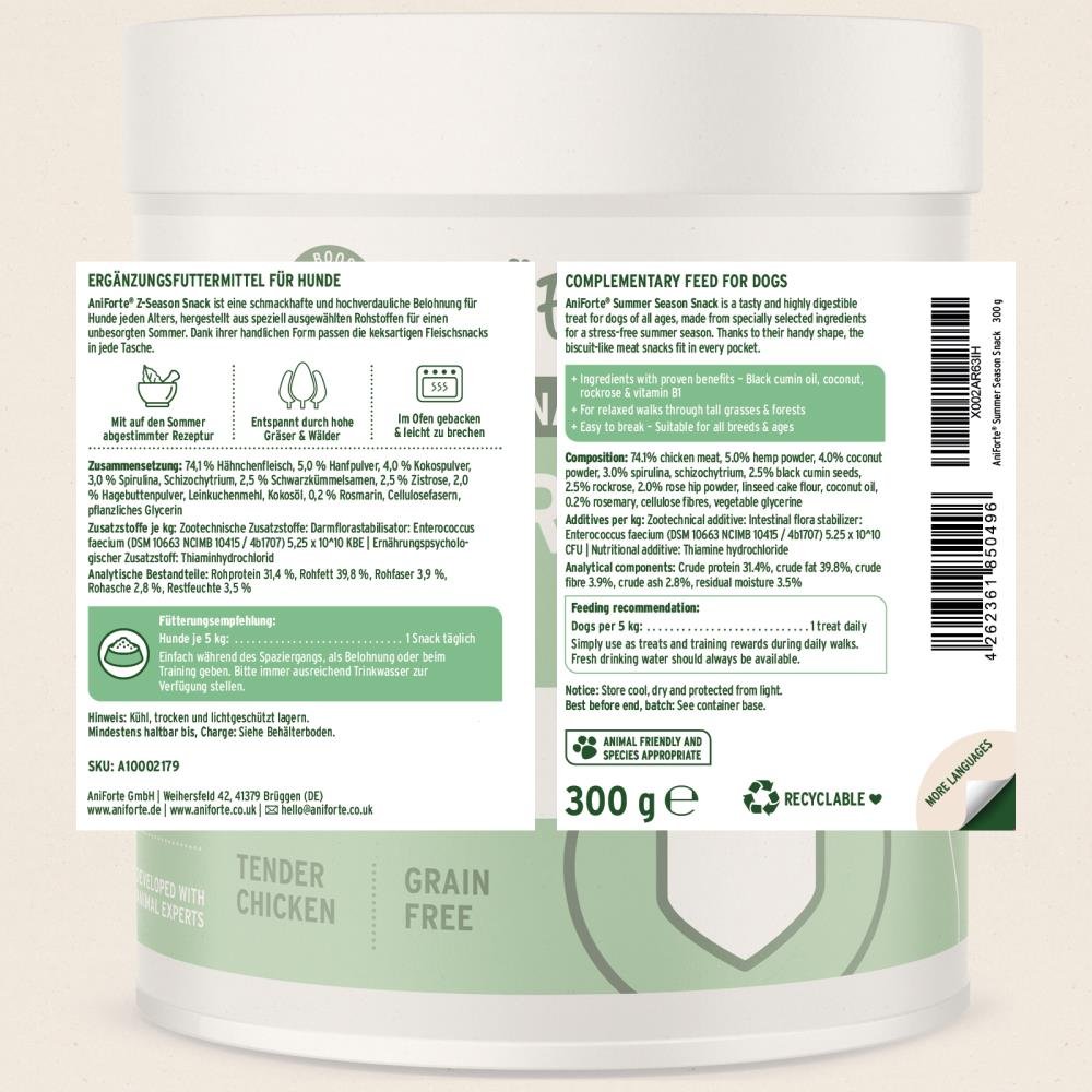 Es gibt kaum ein schöneres Gefühl, als mit deinem Hund die Natur zu genießen, im Sommer gemeinsam unbeschwert im hohen Gras zu spielen und im Wald spazieren zu gehen. Die AniForte® Sommersnacks sind der ideale Begleiter für eure Ausflüge und ein absolutes Must-have! Ein leckeres und gut verdauliches Leckerli mit besonders herzhaftem Geschmack dank des besonders hohen Anteils an zartem Hühnerfleisch. Die saftigen Fleischstückchen werden mit hochwertigen Schwarzkümmelsamen, Zistrosenkraut und Kokosöl kombiniert - dabei sind sie komplett getreidefrei.