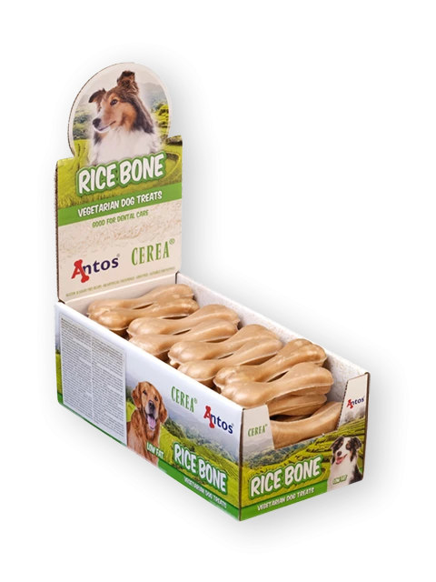 - Cerea Rice Bone: Der Renner des Cerea®-Sortiments und die vegetarische Wahl oder Alternative zu den bekannten Hundeknochen mit Fleisch. Jeder und jeder Hund liebt den Antos Cerea Rice Bone. Dieser vegetarische Kausnack auf Reisbasis ist bei Hunden und Hundeeltern gleichermaßen beliebt. Dass dieser harte Kauknochen auch zur täglichen Zahnpflege deines Hundes beiträgt, ist kein Zufall. Mit diesem Artikel kannst du deinen Hund täglich verwöhnen. Der hohle Boden hilft, die Zähne während des Kauens sauber zu halten. Dieser Erfolgsgarant trägt zu frischem Atem bei, ist vollständig verdaulich, hat einen geringen Fettgehalt (nur 1,5 %) und hat die ideale Größe für große und kleine Hunde. Diese Reisknochen schmecken köstlich und sind einfach richtig gut!