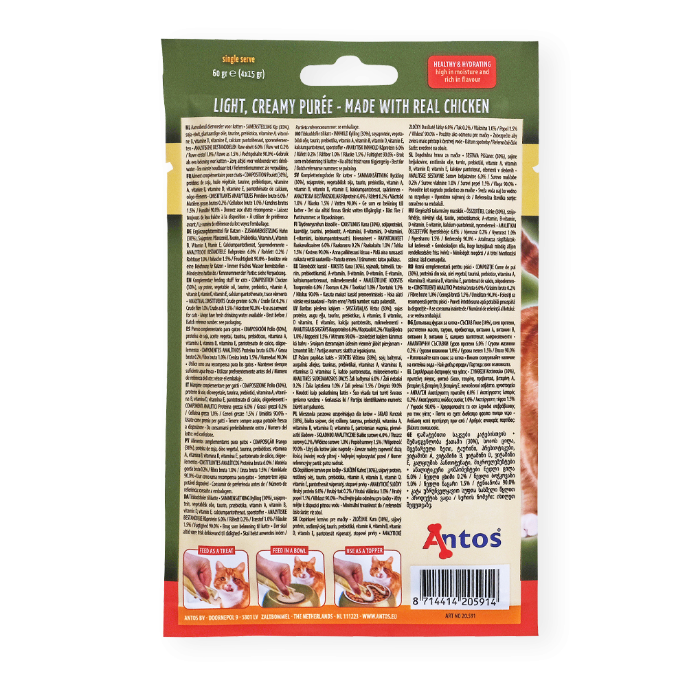 Unsere Katzenleckerlis Püree Huhn sind aus leckeren, hochwertigen Zutaten hergestellt. Jede Tube hat 90 % Feuchtigkeit, was sie zu einem hydratisierenden, gesunden Leckerbissen für deine Katze macht, den du ihr mit gutem Gewissen geben kannst. Wir verzichten auf Getreide und Zusatzstoffe und fügen stattdessen Gutes wie Taurin und verschiedene Vitamine hinzu, um die allgemeine Gesundheit deiner Katze zu fördern.