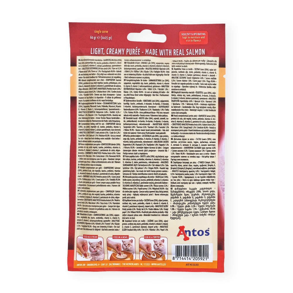 Bereite deiner Katze die ultimative Freude mit Katzenleckerlis Püree Lachs. Diese Einzelportionen werden aus echtem Lachs hergestellt und enthalten verschiedene Vitamine. Deine Katze wird die weiche und saftige Konsistenz lieben. Sie liefern wichtige Feuchtigkeit (90 %), damit deine Katze hydriert bleibt. Serviere sie als Snack, Leckerli für zwischendurch oder als Topping.